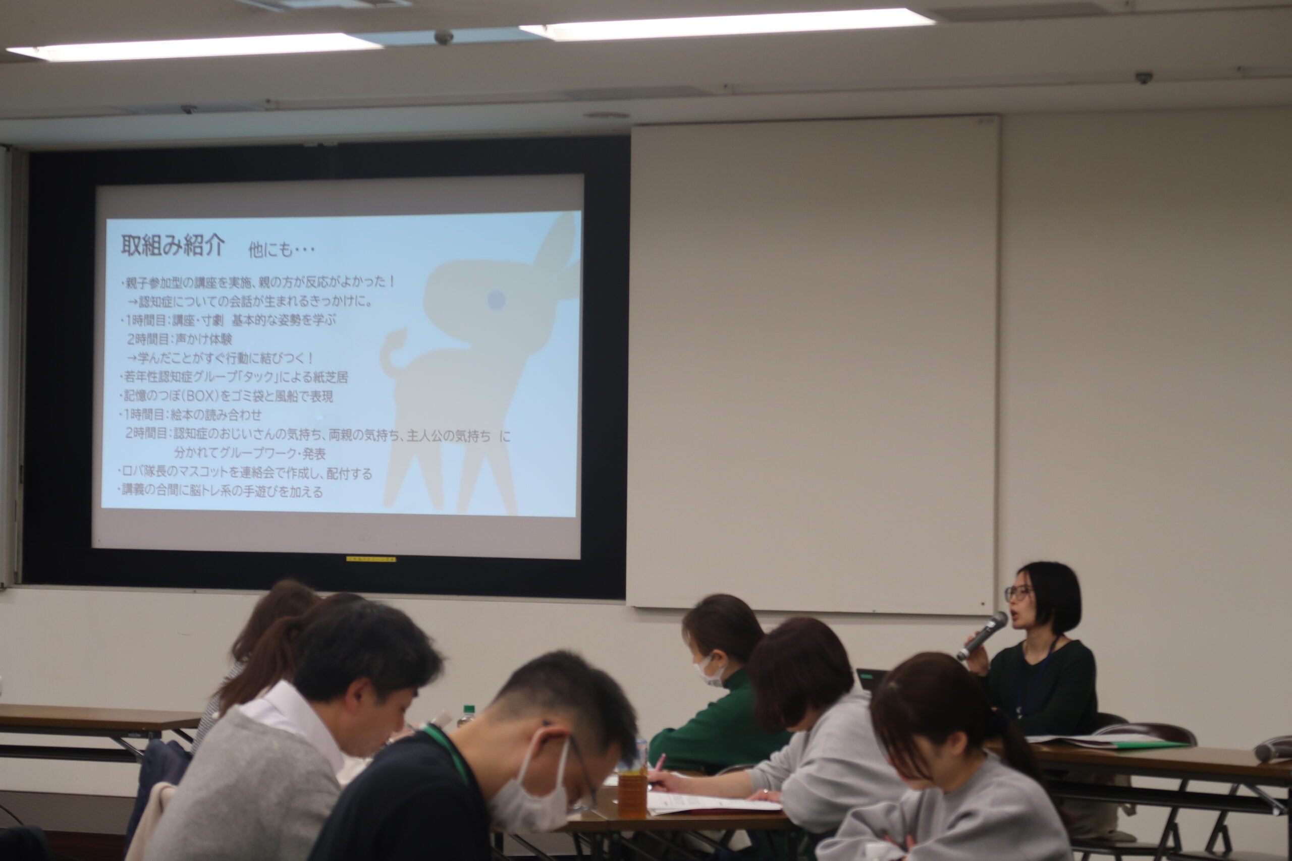 研修の前半部分では、大阪市キャラバン・メイト事務局の馬場から、国の認知症施策の流れや事前集約した各区キャラバン・メイト連絡会でのキッズ向け講座の取組みについて紹介しました。