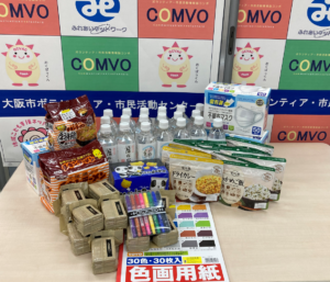 株式会社Win-Worksから 色画用紙・マジック・お菓子・即席めん・アルファ化米・マスク・保存水などを提供いただきました