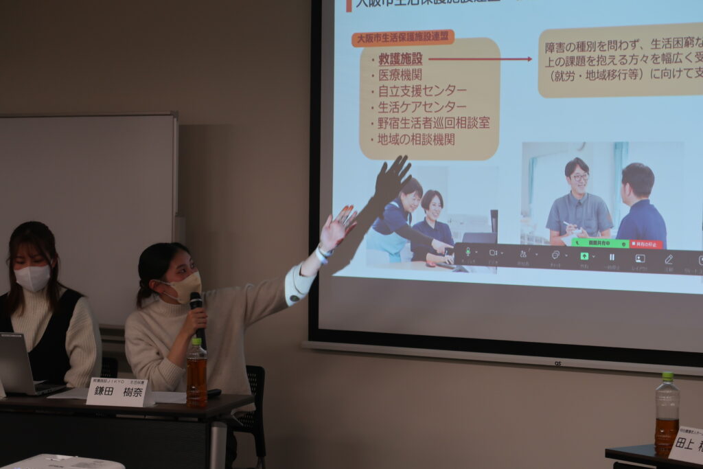 | 前半は、各分野の社会福祉施設で働く若手職員等10人から施設の役割や仕事内容を紹介し、大阪市地域福祉施設協議会と大阪市老人福祉施設連盟の加盟施設職員からは連盟での取組みについても報告がありました。後半は、質問用紙を使って学生からの質問や感想を募り、「福祉業界を選んだきっかけ」「就職活動の進め方」「職場の人間関係や雰囲気」「利用者との関係性構築」などのテーマで、全体でパネルトークを進めました。 |