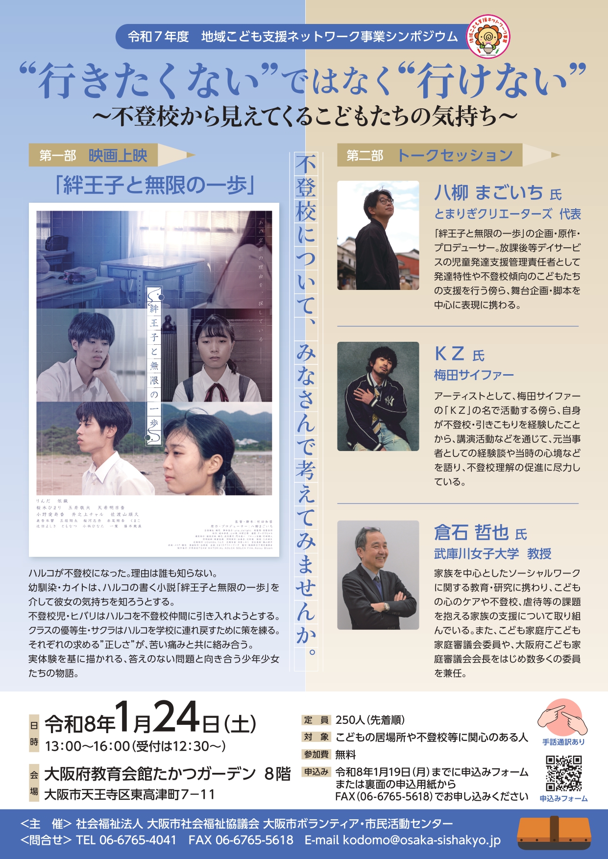 | 不登校児童や生徒、保護者等が置かれている状況や背景を、より深く理解してもらうため、第一部では不登校を題材にした映画「絆王子と無限の一歩」の上映、第二部では不登校に関する専門家や元当事者等を交えたトークセッションを行います。ぜひ、ご参加ください。 |